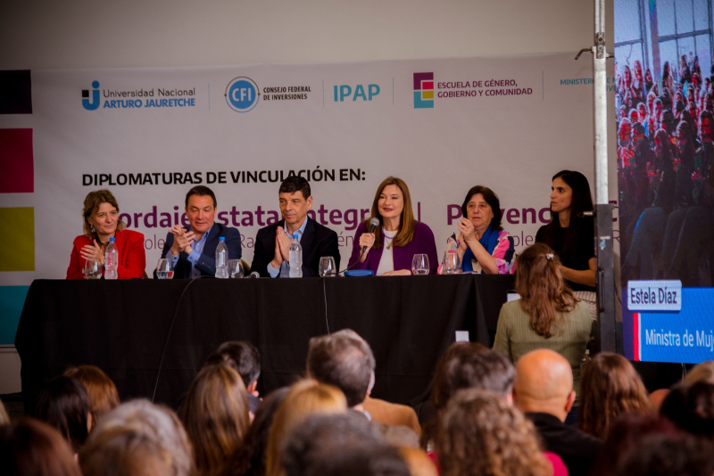 La ministra de Mujeres y Diversidad de la provincia de Buenos Aires, Estela Díaz, junto al intendente de Florencio Varela, Andrés Watson y al rector de la Universidad Nacional Arturo Jauretche (UNAJ), Arnaldo Medina, entregaron los diplomas a las y los 1153 estudiantes, de 121 distritos bonaerenses, 8 provincias y 169 organizaciones comunitarias, que completaron las Diplomaturas en Abordaje Estatal y en Prevención Comunitaria de las Violencias por Razones de Género.