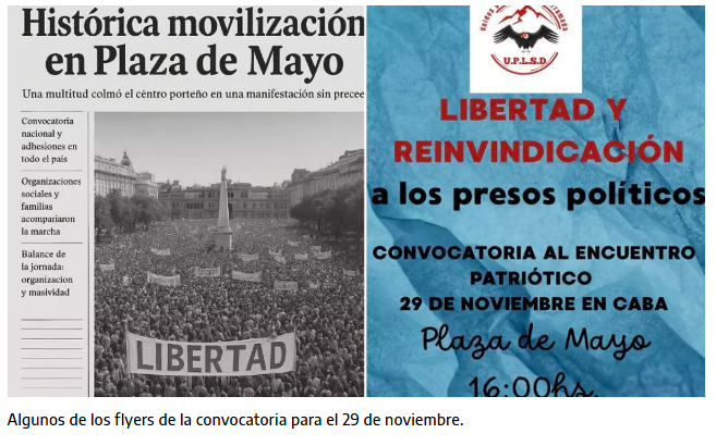 Además de la agrupación “Unidos por la sangre derramada”, la convocatoria para el 29 de noviembre también la impulsan “Pañuelos Negros” –cuyo logo es el mismo que el de las Abuelas y Madres de Plaza de Mayo, pero pintado de negro– y una organización que lleva una cobra como símbolo y la frase “Unidad de cuerpo. Masa crítica para la victoria”. En los avisos también hay referencias a alias de billeteras virtuales y CBU de cuentas bancarias para recibir donaciones para la manifestación. La movilización surgió luego de un acto realizado por ex militares en Tucumán, en febrero pasado, por los 50 años del llamado Operativo Independencia.