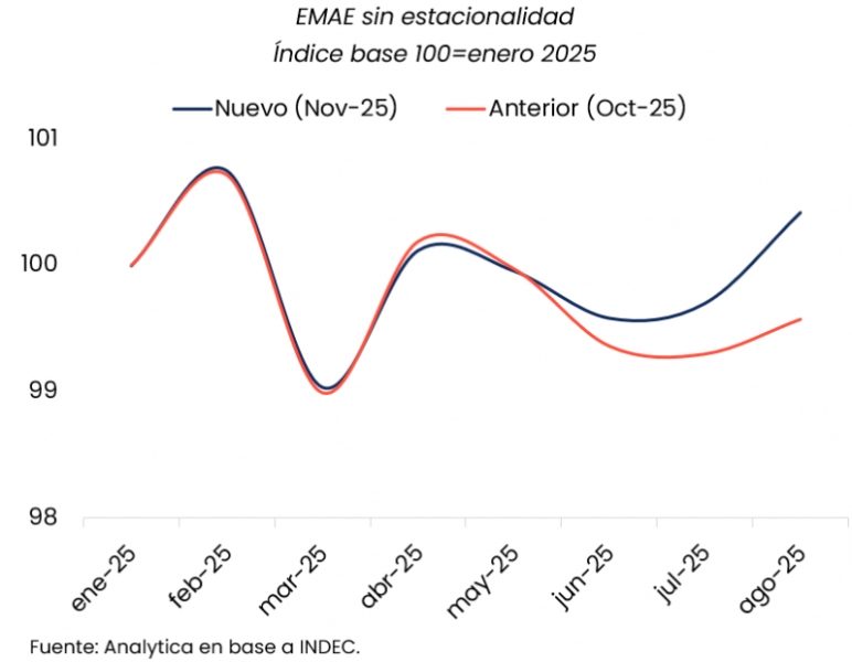 "Al observar el comportamiento del nivel general, identificamos que la serie desestacionalizada revisada quedó en promedio un 0,23% por encima de la serie previa, mientras que la versión con estacionalidad prácticamente no presenta diferencias", destaca Analytica. "A nivel sectorial, las revisiones no fueron homogéneas. El caso más notorio es el de Hoteles y Restaurantes, cuyo índice original aumentó 3,8% respecto a la versión previa, convirtiéndose en la corrección de mayor magnitud dentro del EMAE", continúa y resalta que los cambios no se limitaron a un mes sino a todo el año.