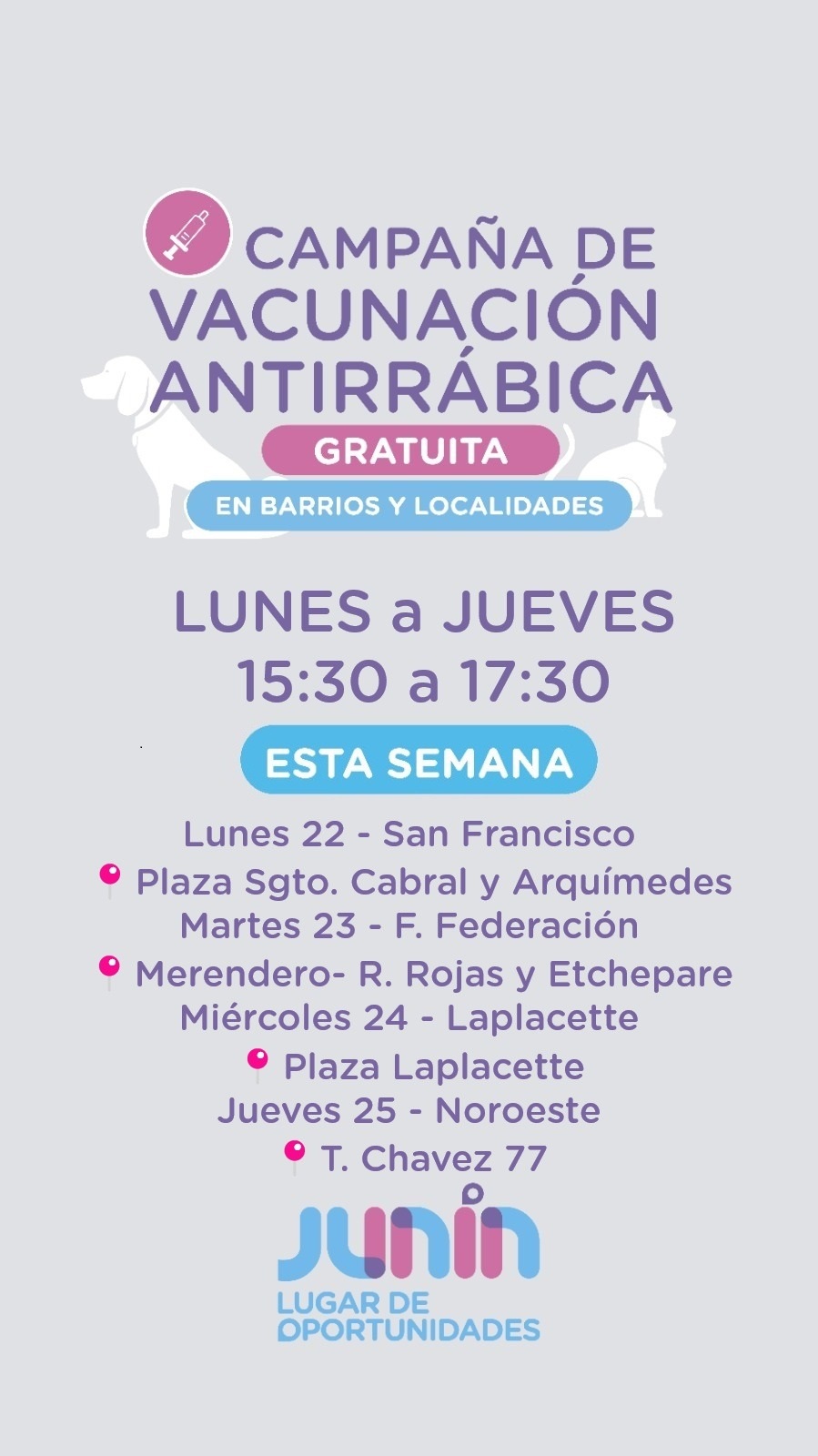 “Esta semana continuamos con los operativos de vacunación en distintas plazas y barrios de la ciudad, en este sentido el martes 23 estaremos en el Fuerte Federación, en la sede del merendero de Ricardo Rojas y Etchepare, el miércoles 24 en el Paraje de Laplacette, en la plaza y el jueves 25, en el barrio Noroeste, en Telésforo Chávez 77, siempre en el horario de 15:30 A 17:30", finalizó.