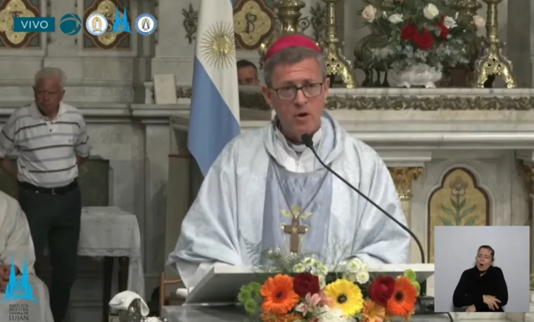 El obispo reconoció que los peregrinos llegan a Luján con “nuestras cruces personales, con dolores y tristezas, cargando fracasos y broncas” para decirle a la Virgen que “necesitamos tu amor de Madre, ese amor que cura, ese amor que no juzga, ese amor que nos levanta y que nos anima en la esperanza”.