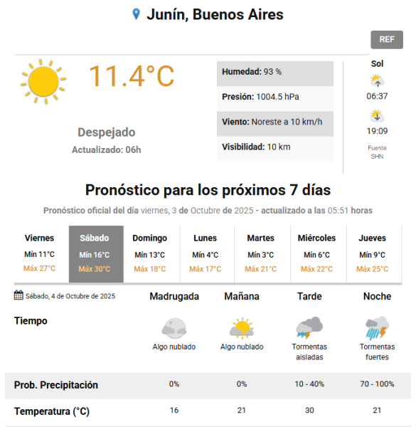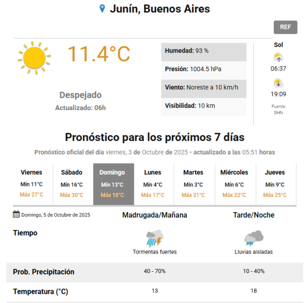 En Junín se espera un lindo viernes soleado, con 27 grados de máxima y 11º de miníma, mientras que el sábado se esperan 30º de máxima con 16 grados de mínima, pero con tormentas aisladas durante la tarde y fuertes en la noche continuando durante la madrugada y en la mañana del domingo, mientras que a la tarde noche se esperan tormentas aisladas, con 18 grados de máxima y 13º de miníma.